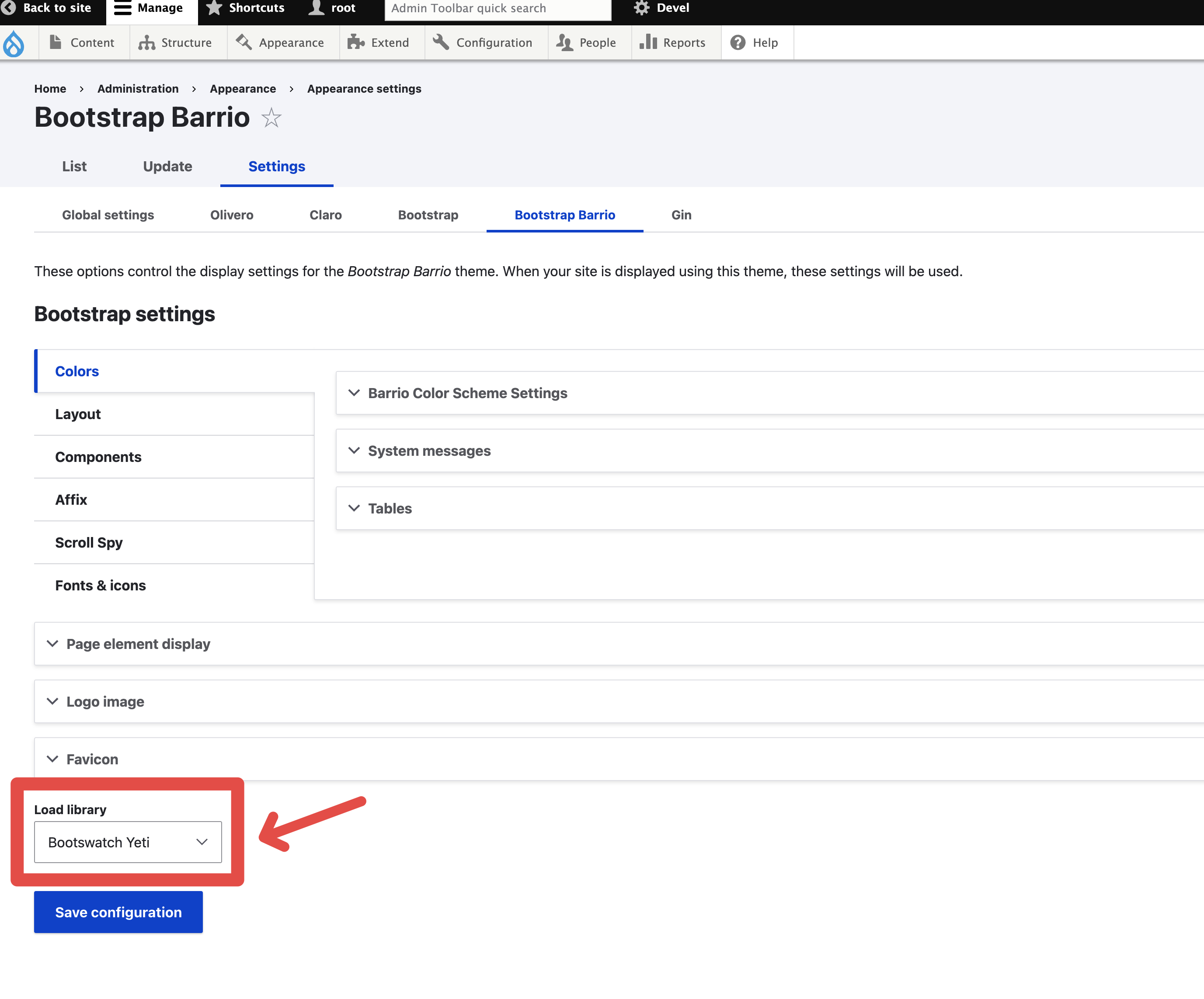 bootstrap(Bootstrap5) and have set it as your default theme - Also remeber to choose a “load libary” in the installed theme’s setting (see: screenshot for instruction) if you don’t the theme will be style-less.