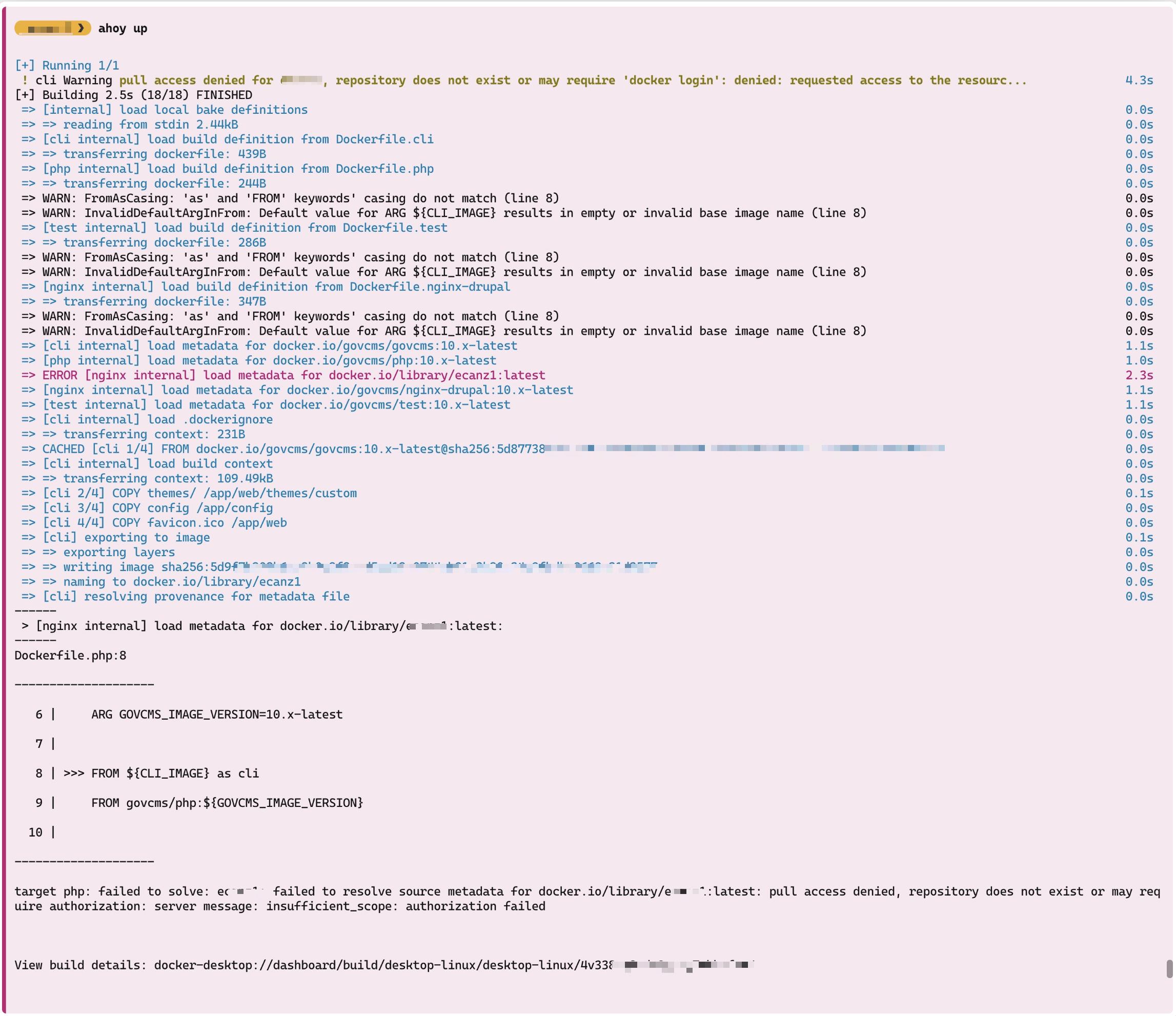 target php: failed to solve: govcms-project-name: failed to resolve source metadata for docker.io/library/govcms-project-name:latest: pull access denied, repository does not exist or may require authorization: server message: insufficient_scope: authorization failed