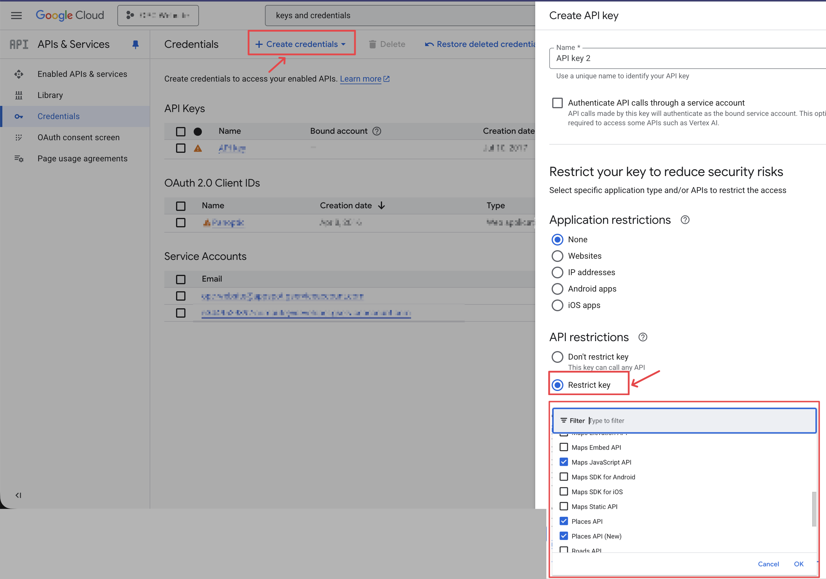 - search “Credentials” to go to “Keys and Credentials” page, and copy your API keys there (or create one using the “+ Create Credentials” button on the top, and restrict it to the only have access to the Place APIs + Maps JavaScript API, see screenshot: link)