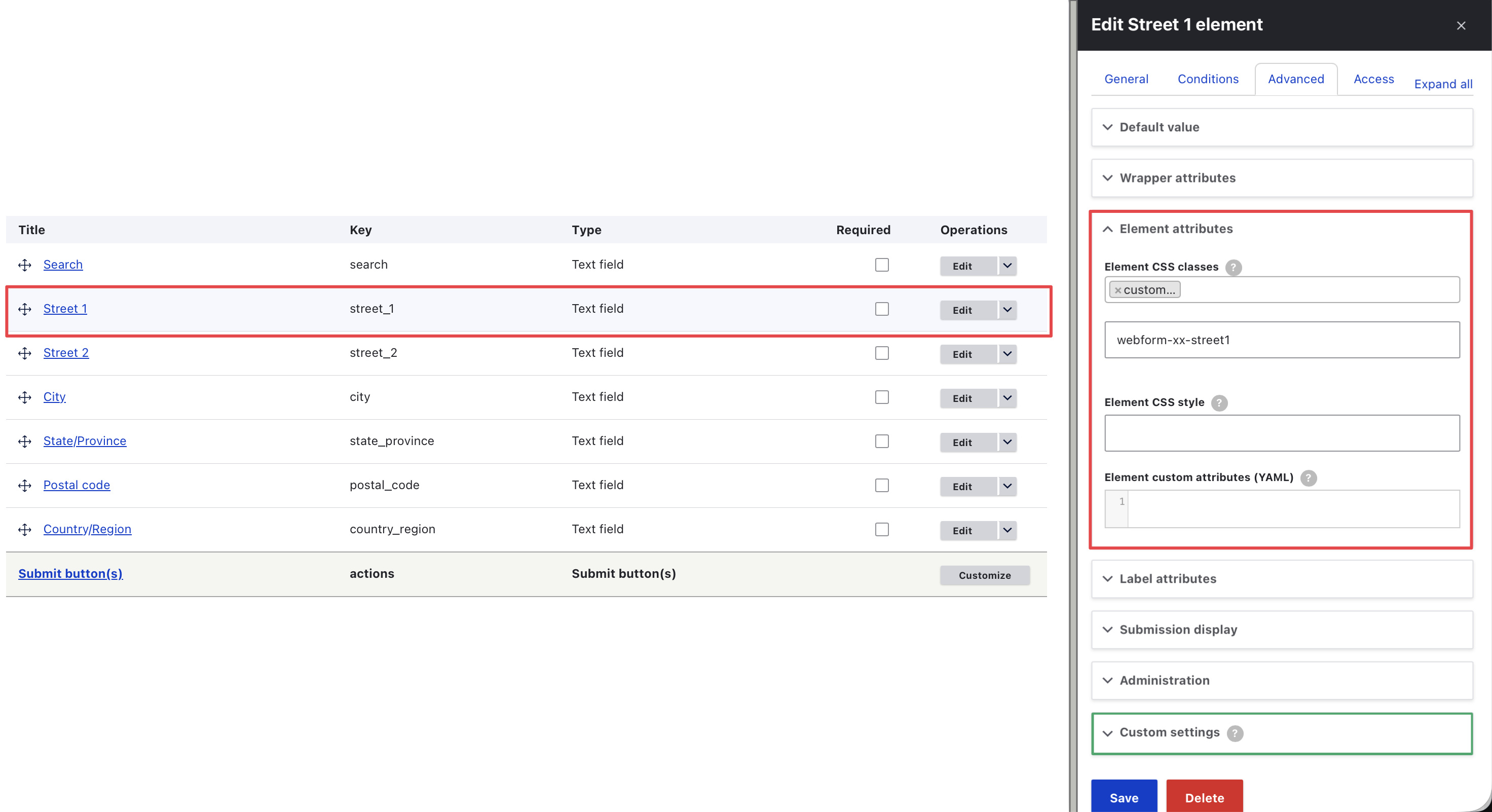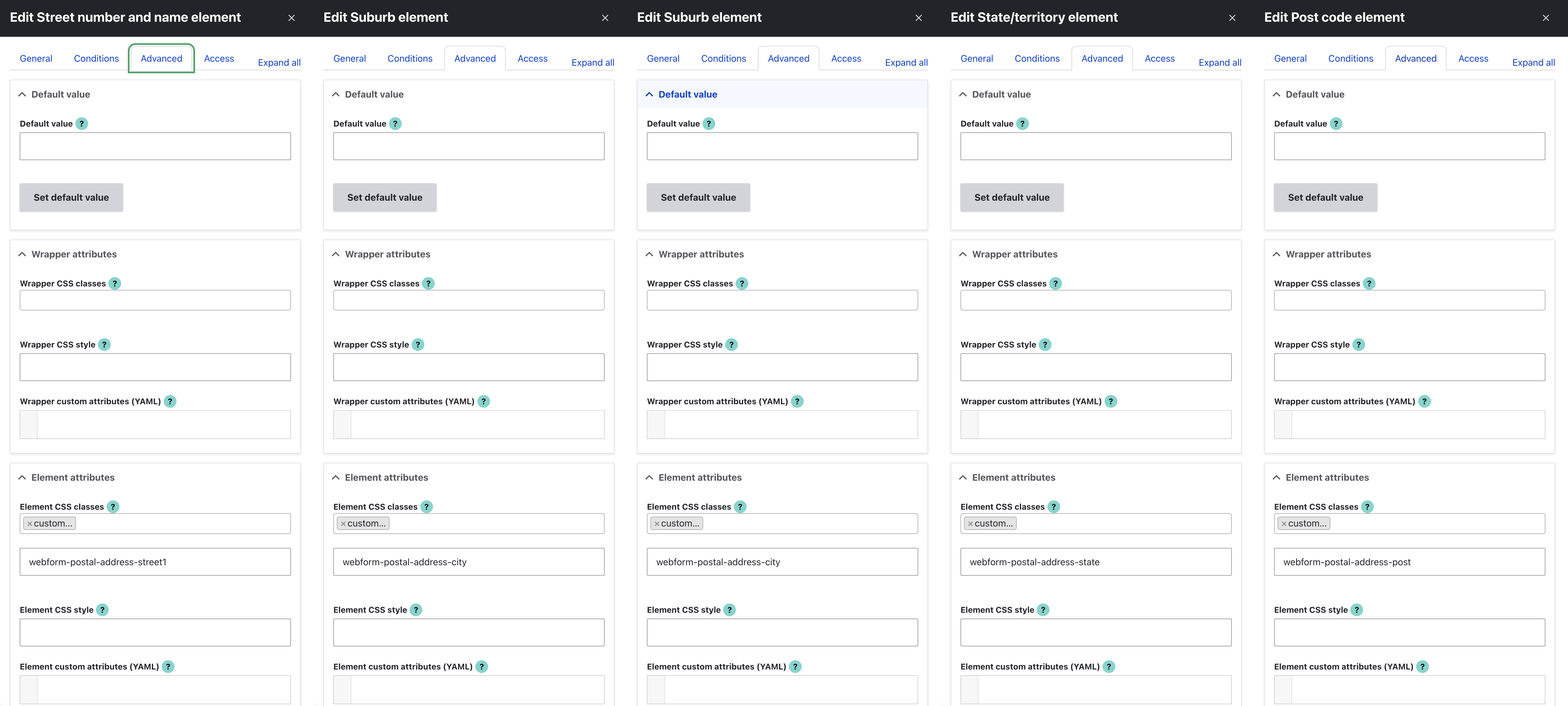 - For all the address related fields (e.g. street, suburb, city, country) add custom element CSS classes respectively to be later used by JavaScript to fill their values, see screenshot