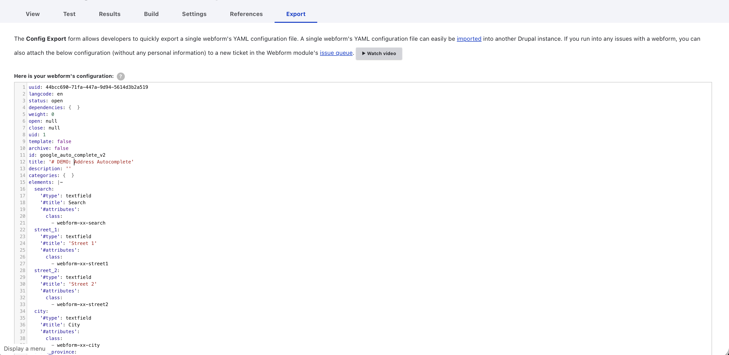Create a plain text field in webform to use as the “search field” for address, see screenshotFor all the fields relating to address add custom class to be used later by JavaScript (here is an example: screenshot of add.webform-xx-street1class to the field “Street1”)Add the following JavaScript (at Webform > Settings > CSS/JS) that uses Google Place API to fill address: demo-auto-complete.js (*alternatively if you don’t want to expose your API in the webform Drupal backend settings, you can also include the Place API via Drupal library: your-theme-name.libraries.yml, page–webform.html.twig; Here’s a full example webform that uses this approach: webform-export-yaml-file and where-to-past-it-to-screenshot)Review the outcome of step1 to step3: outcome-gif (if your API key is invalid you might see your search box turn grey (invalid) and get the following error in your console:Failed to load resource: the server responded with a status of 403 ), see screenshot: sample-console-error-api-invalid)You can go one step further and have multiple pairs of “search + street/city/state/post input” as well, see the demo javascript file: auto-complete-multiple-input.js, and here’s the final outcome: multiple-autocomplete-example