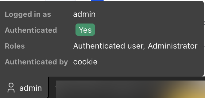 - shows current user, roles and auth context