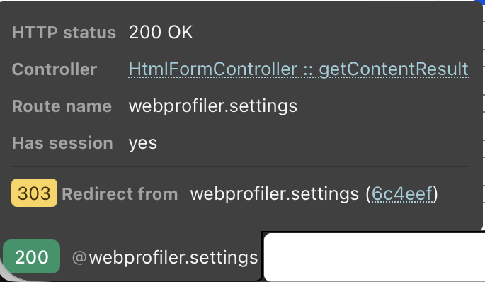 - Profiler toolbar on the error page: Even when the request blows up, the WebProfiler toolbar still appears at the bottom of the error page, so you can open the full profile for that failed request: database queries, events, forms, cache, timeline, etc.