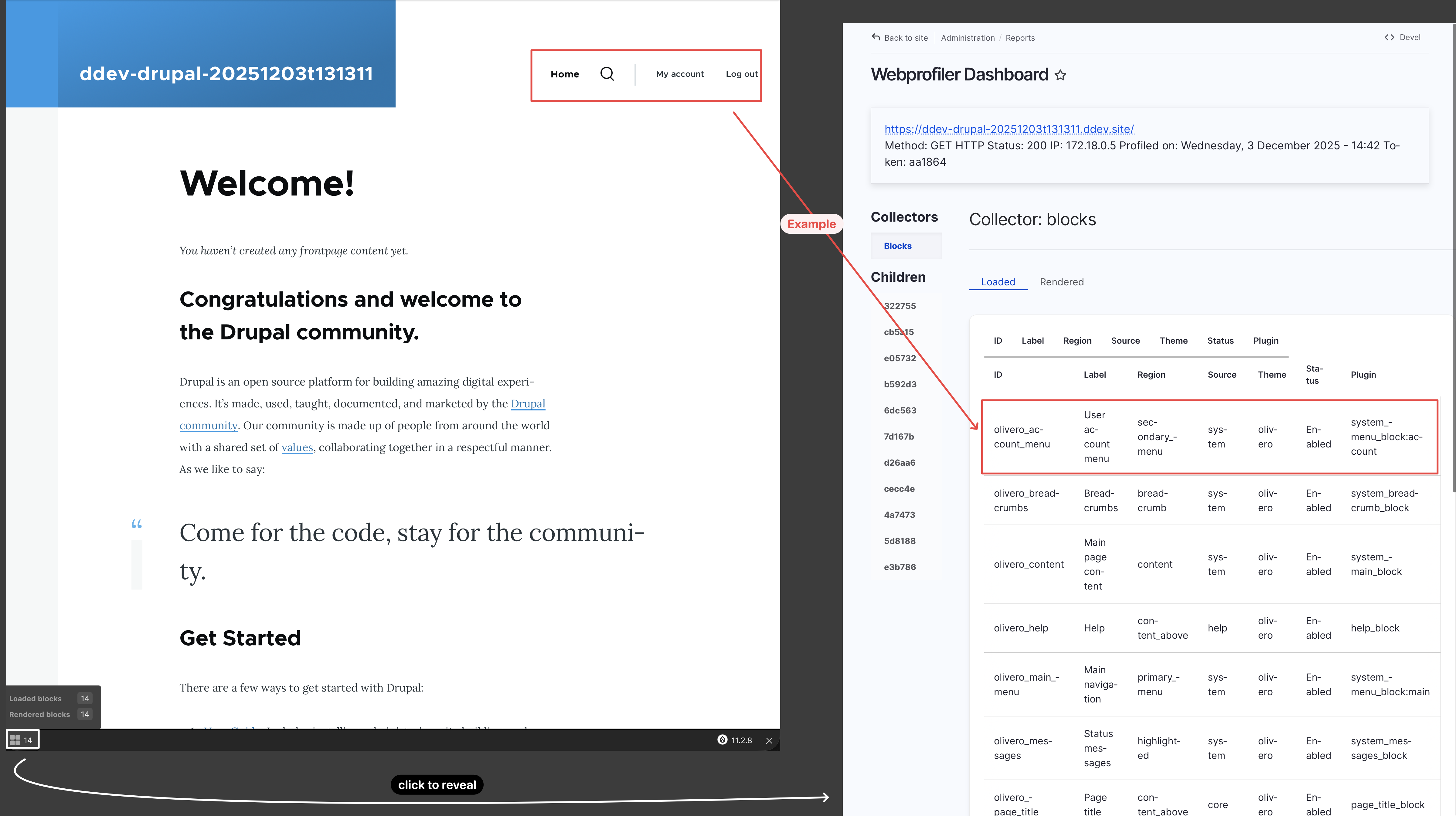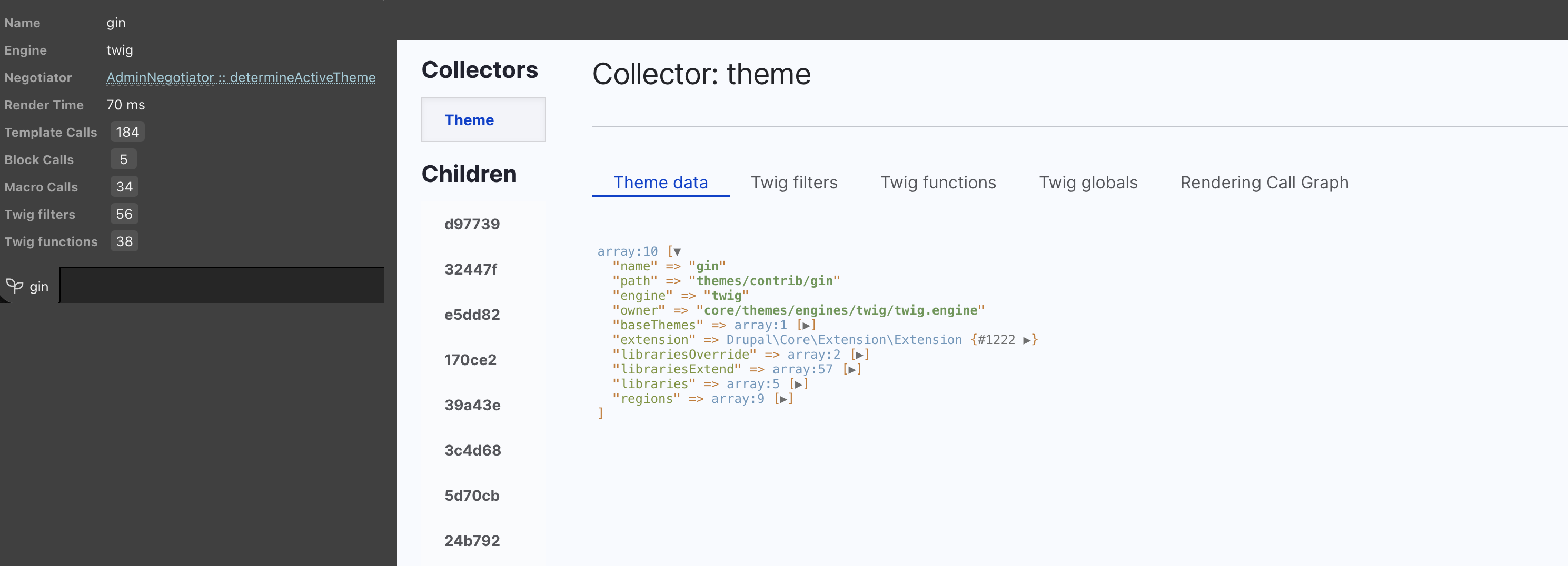 - lists rendered blocks, regions, providers and timings (sometimes you may need to turn off the caching for this toolbar item to show all the blocks)