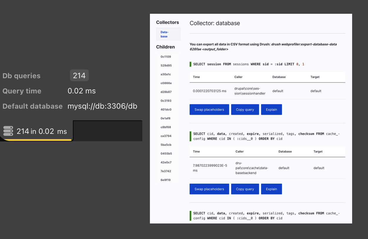 WebProfiler basically replaces Drupal’s boring and un-styled “The website encountered an unexpected error” with a Symfony-style debug page that’s actually useful. It adds the following: