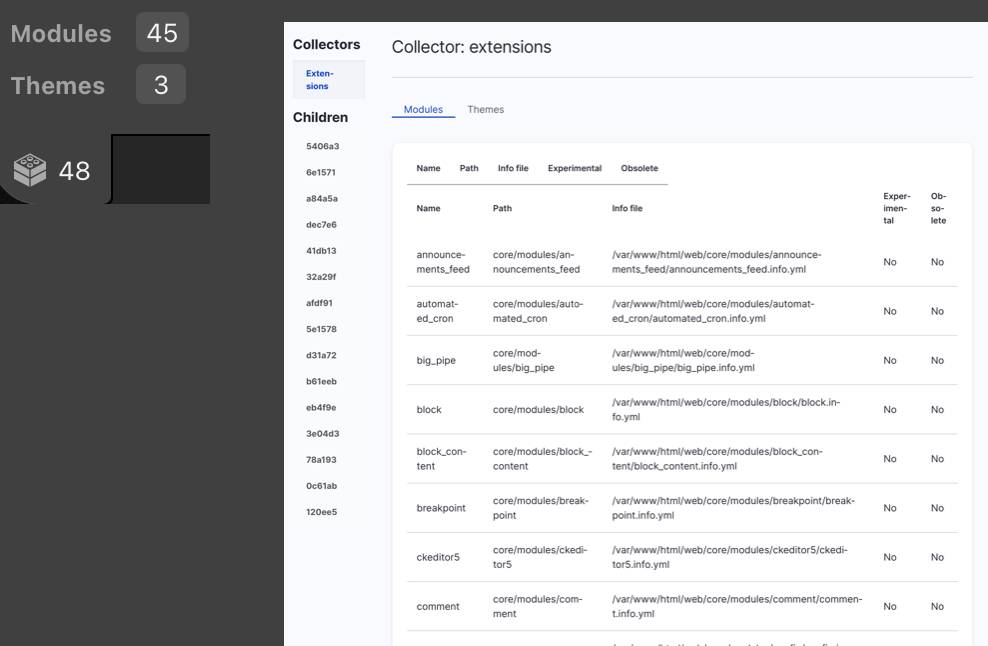 - lists enabled/disabled modules and themes with versions